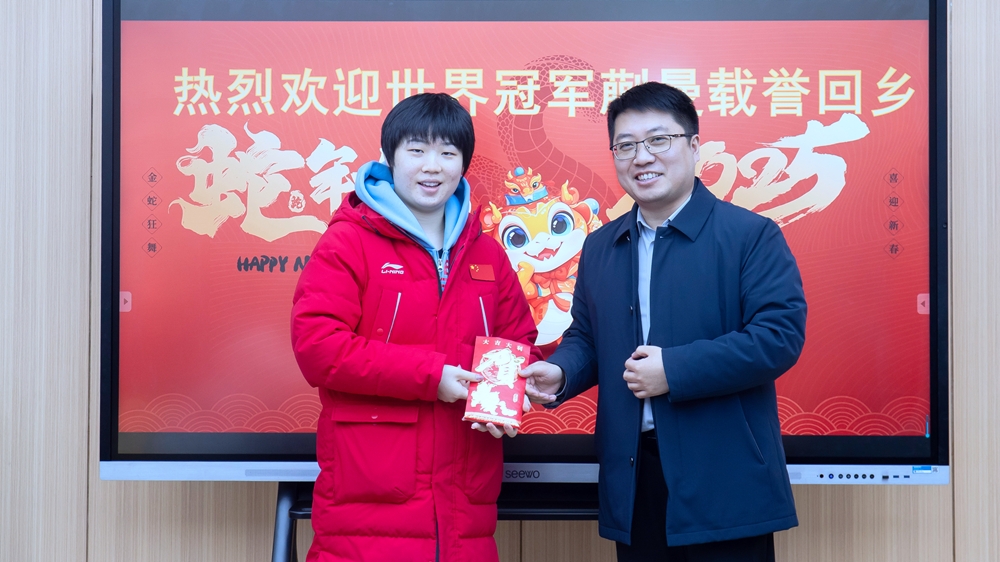 夏斯馨代表县委县政府对蒯曼回射过年表示热烈欢迎,对蒯曼取得的优异成绩表示热烈祝贺。蒯曼肩负着祖国和人民的殷切期望、满怀为国争光的强烈信念,顽强拼搏、勇攀高峰,成功获得乒乓球世界冠军,也是盐城首位乒乓球世界冠军,为祖国和家乡赢得了荣誉。体育强则中国强,国运兴则体育兴。蒯曼在世乒赛上追求卓越的意志品质和昂扬向上的精神风貌,展示了华夏健儿追梦逐梦的奋斗英姿,激发了中华儿女奋发图强的爱国热情。
