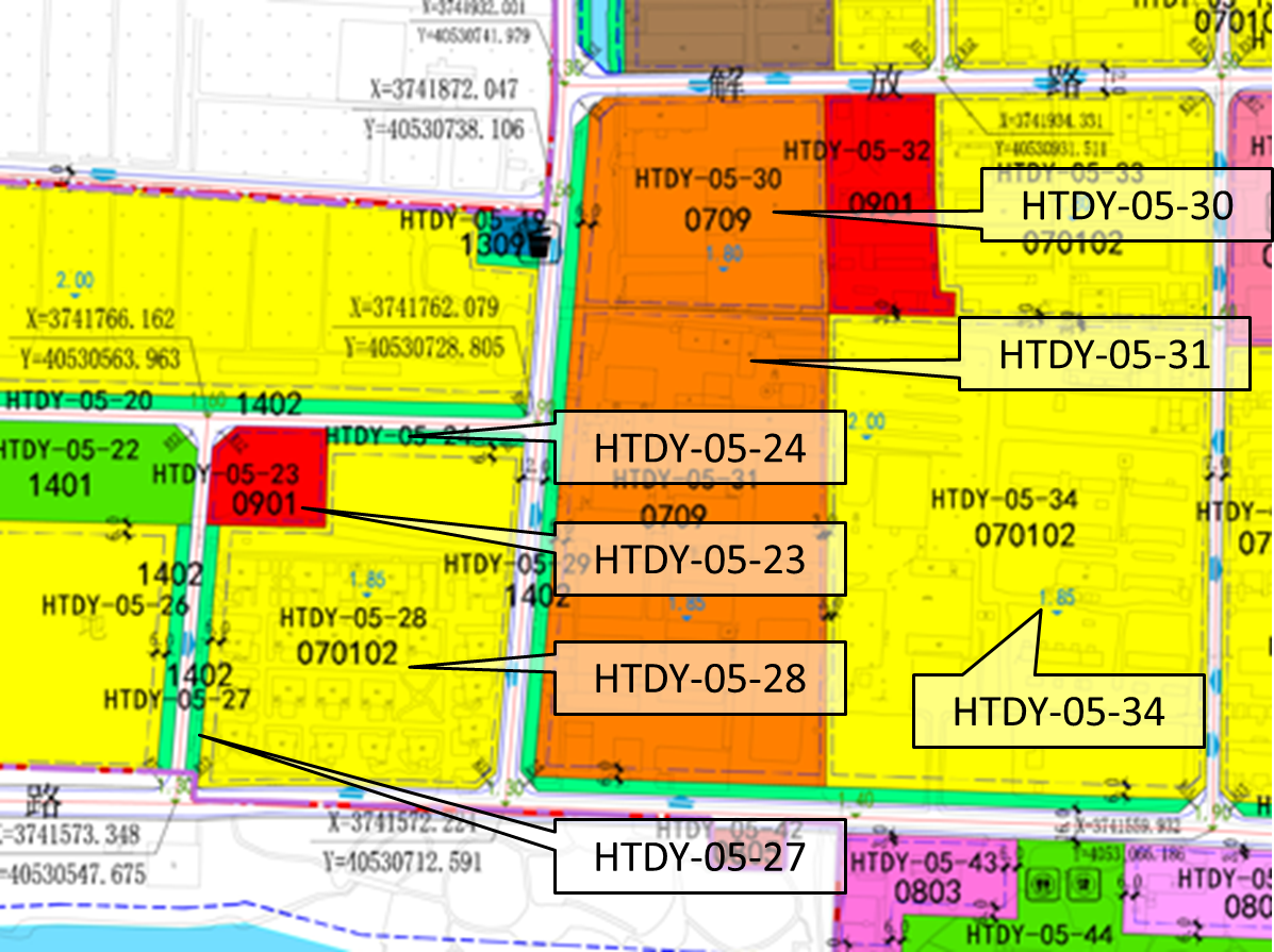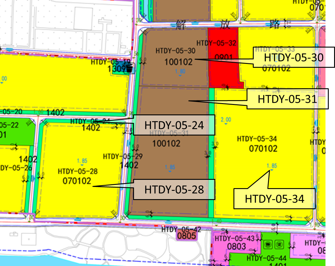 (2)将HTDY-05街区图则内HTDY-05-23地块分别合并至HTDY-05-24、HTDY-05-28地块,并将HTDY-05-27地块合并至HTDY-05-24地块,HTDY-05-30、HTDY-05-31地块用地性质由商住混合用地调整为二类工业用地。
