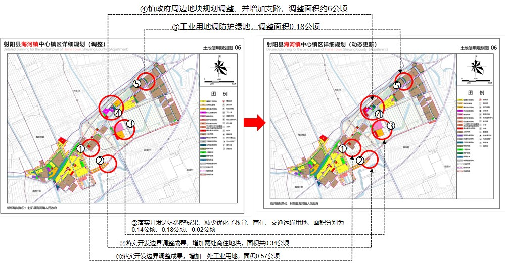 根据射阳县城镇开发边界调整成果及海河镇未来发展方向,本次更新涉及调整地块为机关团体用地、教育用地、商业用地、工业用地、城镇住宅用地、商住用地、公园绿地、防护绿地、交通运输用地等,调整面积共涉及约7公顷。