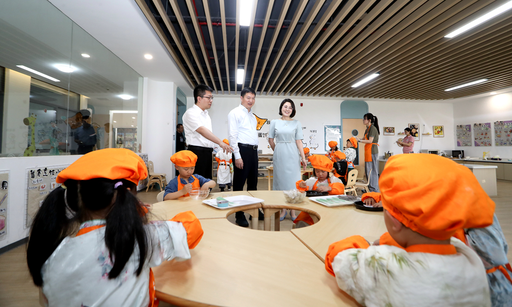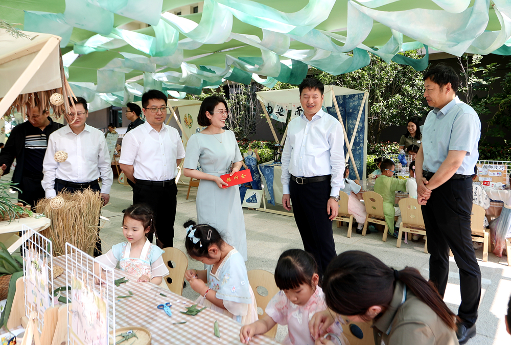 走进射阳县幸福幼儿园,孩子们正在老师的带领下体验包粽子、剪纸、草编等传统文化项目和非遗技艺。王宁俯下身子与小朋友亲切互动,向孩子们送上节日祝福。他说,幼儿时期是人生最重要的启蒙阶段,广大教师要牢记为党育人、为国育才的初心使命,循循善诱、春风化雨,以实际行动做新时代儿童的引路人、守护人、筑梦人。