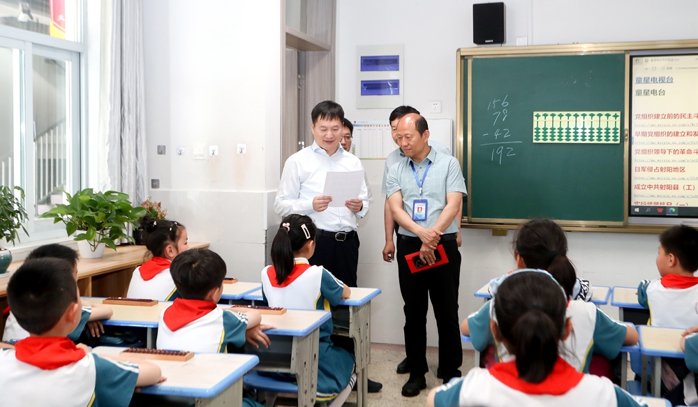 来到射阳县实验小学体育路校区,王宁详细了解学校办学情况,并现场观摩特色课堂教学。只见课堂上师生互动活跃,学生踊跃回答问题,王宁对孩子们的学习状态表示赞赏,并勉励他们争做德智体美劳全面发展的好少年。王宁强调,要用心用情关爱少年儿童,坚持不懈办好人民满意的教育,进一步做优教育功能、强化教育质量、完善教育设施,让“学在射阳”的成色更足、品牌更亮。要在全社会营造尊师重教的良好风尚,让教师成为最受社会尊重和令人羡慕的职业。要全力做好校园消防、食品、治安等方面安全管控,为少年儿童茁壮成长、健康成才创造有利条件。