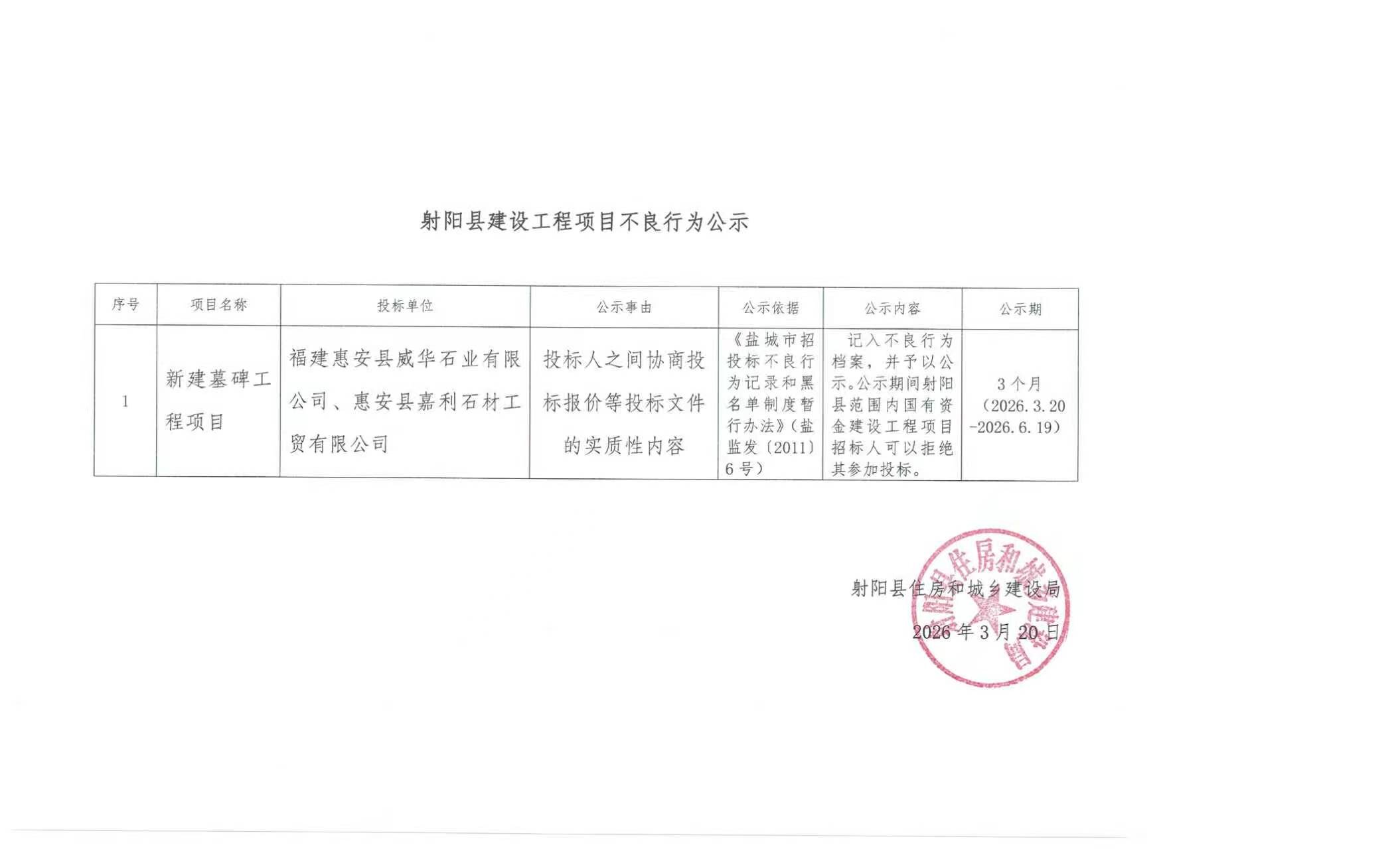 福建惠安县威华石业有限公司、惠安县嘉利石材工贸有限公司不良行为公示