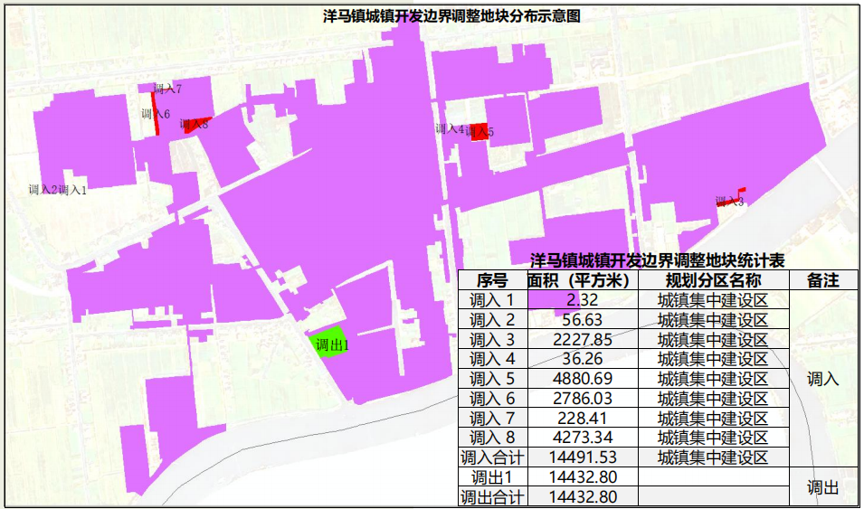 调入、调出面积分别为14491.53m2、14432.80m2。城镇开发边界调整地块分布图及统计表如下图所示: