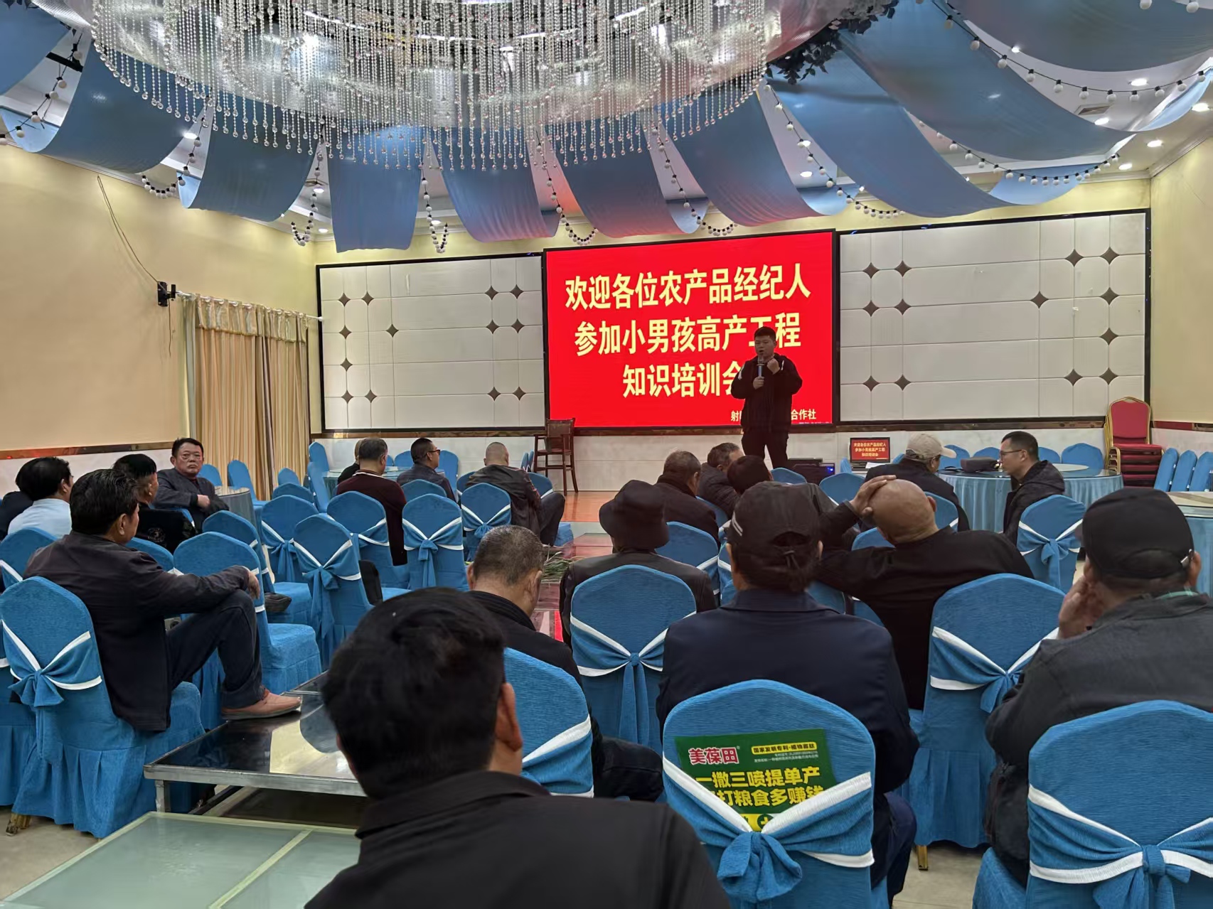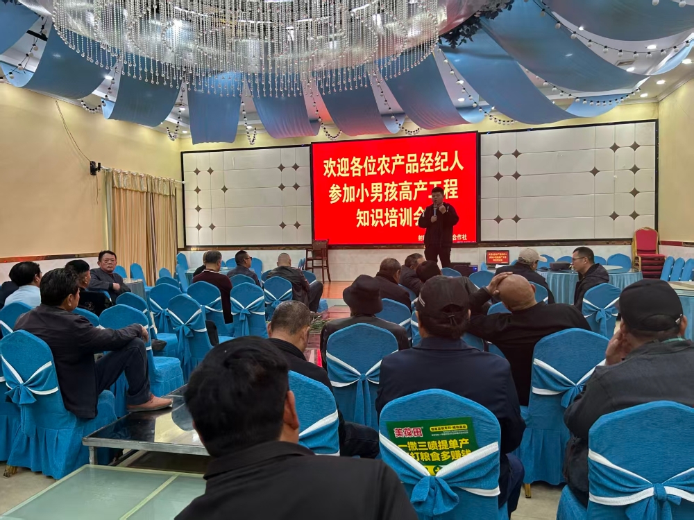 田间实地观摩环节圆满结束后,100余名农业经纪人齐聚鲍墩供销社,参加农作物种植技术专题培训会。会上,盐城A田沃农业公司负责人何建华立足射阳本地农作物种植特点,开展病虫害防治专业授课,详细讲解小麦、水稻等主导作物常见病虫害的识别要点、发生规律,针对性传授绿色防控、科学用药、精准防治的实用技术,为农户日常种植生产提供了专业、可行的技术支撑。随后,种粮大户张寿荣、吴足洋依次登台,结合自身多年种植经历与产品使用体验,分享美葆田系列产品施用技巧、种植管理经验,用真实、接地气的亲身案例,进一步加深了在场农户对优质农资的信任与认可。