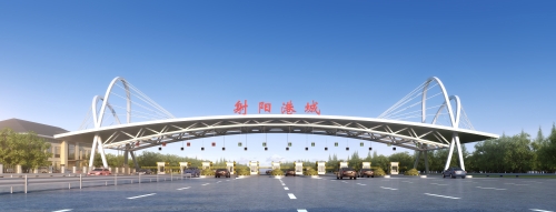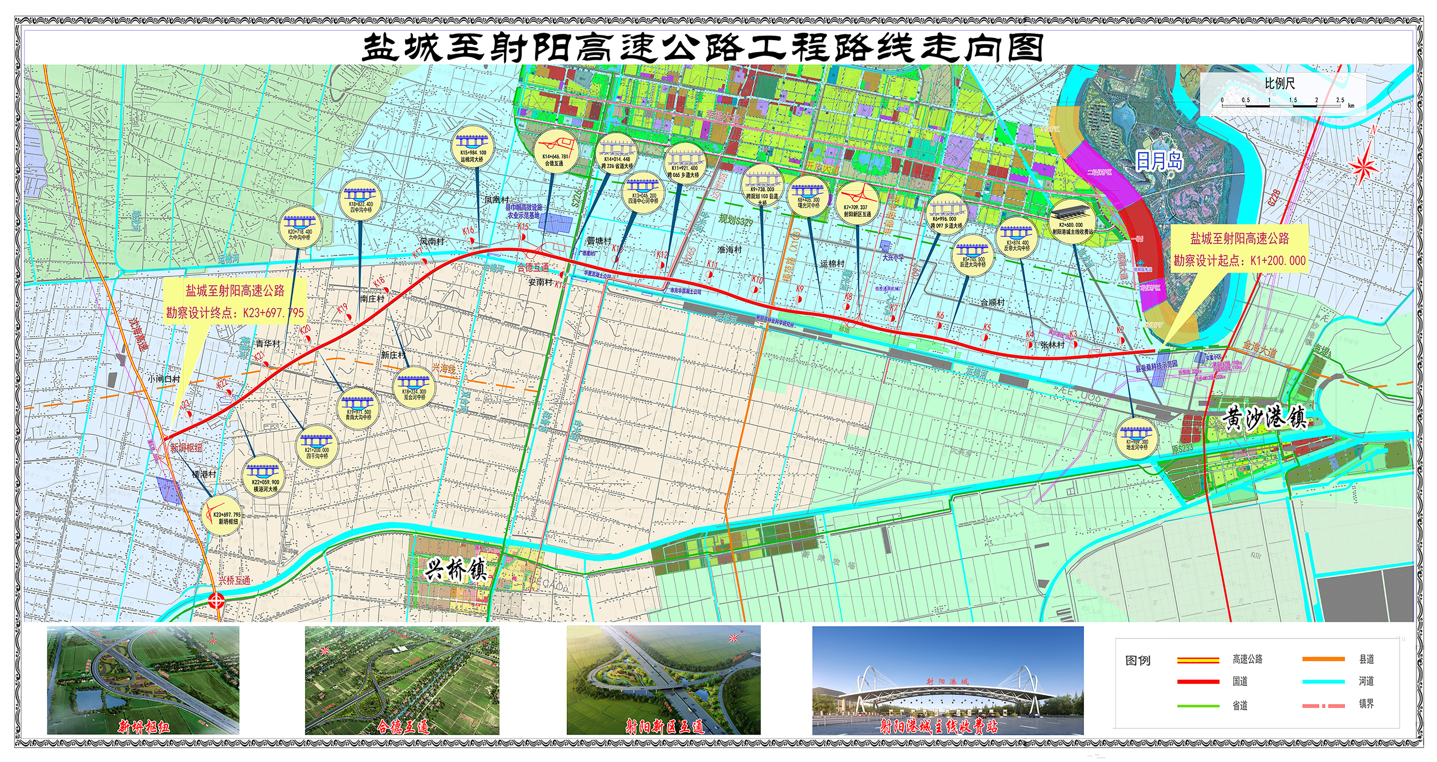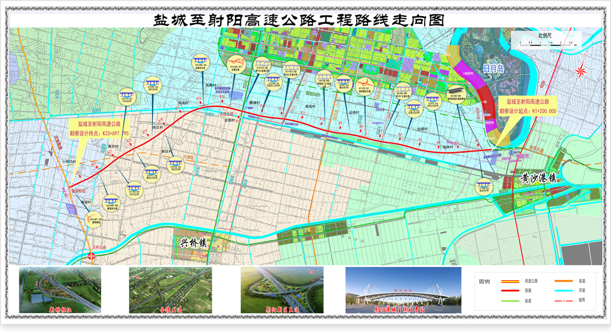 项目起自射阳县日月岛南侧与329省道交叉处,沿射阳县城规划区南侧、运棉河北侧向西,经合德镇、兴桥镇后,路线折向西南,止于盐城北侧新坍镇附近与沈海高速公路交叉处,路线全长22.497公里。项目按照双向四车道高速公路标准建设,设计速度120公里/小时,路基宽度27米;全线设置分离式立交桥4处,长686米;设置新坍枢纽、合德互通、射阳新区互通3处互通式立交,设置主线收费站1处,匝道收费站2处。