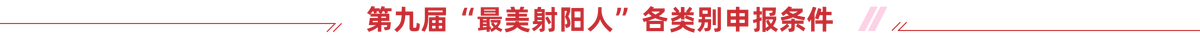 第九届“最美射阳人”基本标准:热爱祖国,拥护党的领导,自觉践行社会主义核心价值观,模范遵守社会道德规范,品德高尚、爱岗敬业、创先争优、甘于奉献、事迹感人、群众公认。优先推荐获中央、省、市综合或主管部门表扬;获中央、省、市主流媒体宣传报道的人员。